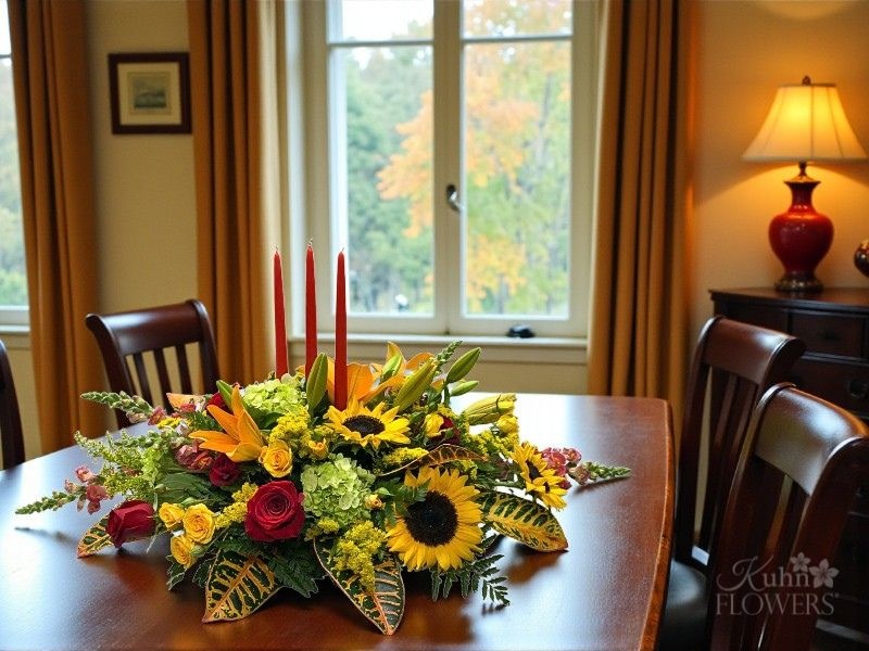 A single, low-profile arrangement works beautifully here. Think about a small vase with a few choice blooms or a simple candle surrounded by fresh greenery. This approach adds a touch of elegance while leaving plenty of room for dishes and conversation. The key is to keep the dining table centerpiece below eye level so everyone can easily see each other. Buy our Autumn Bright Centerpiece.