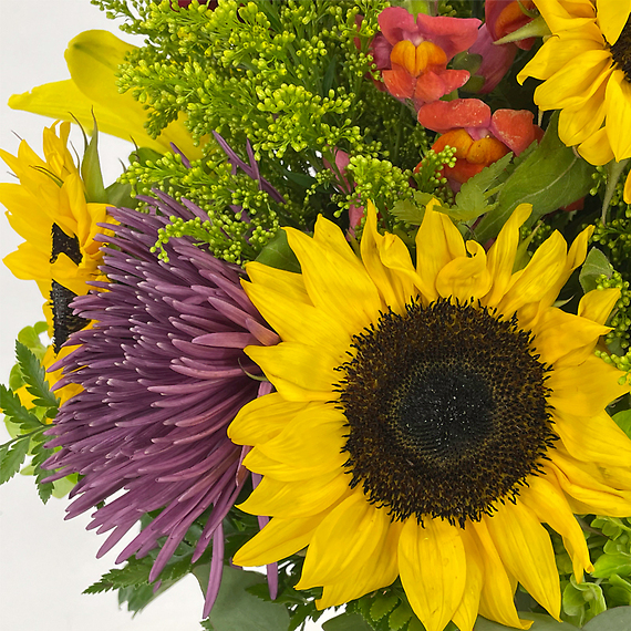 Welcome the crisp fall air with our Autumn Morning arrangement. A beautiful blend of sunflowers, fragrant yellow lilies, red roses, purple Fuji mums, green hydrangeas, carnations, and more are brought together to create a stunning display. The sheer orange ribbon adds a perfect touch of fall flair. Whether you're looking to celebrate a special anniversary utumn occasion or simply enjoy the beauty of the season, this arrangement is sure to please.