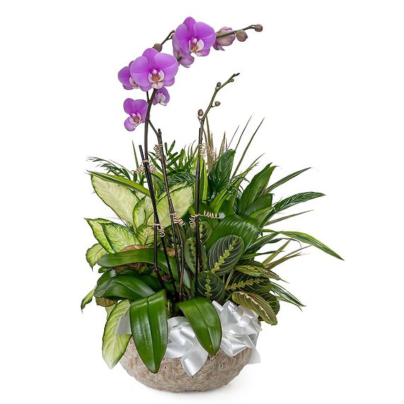 Welcome nature into your home with the Orchid Dish Garden, an exquisite combination of lush, long-lasting green plants hand-selected for their beauty and vitality, plus a single stem of orchids planted in a specialty 14" ceramic dish.