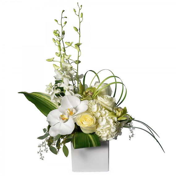 Modern, lush, and elegant this gorgeous floral composite is the perfect combination of lush white and green florals. Dendrobium and phalaenopsis orchids, accompanied by fluffy hydrangeas, roses, and more makes this arrangement a stunning mix of modern-day florals. The arrangement arrives in a white ceramic cube container.